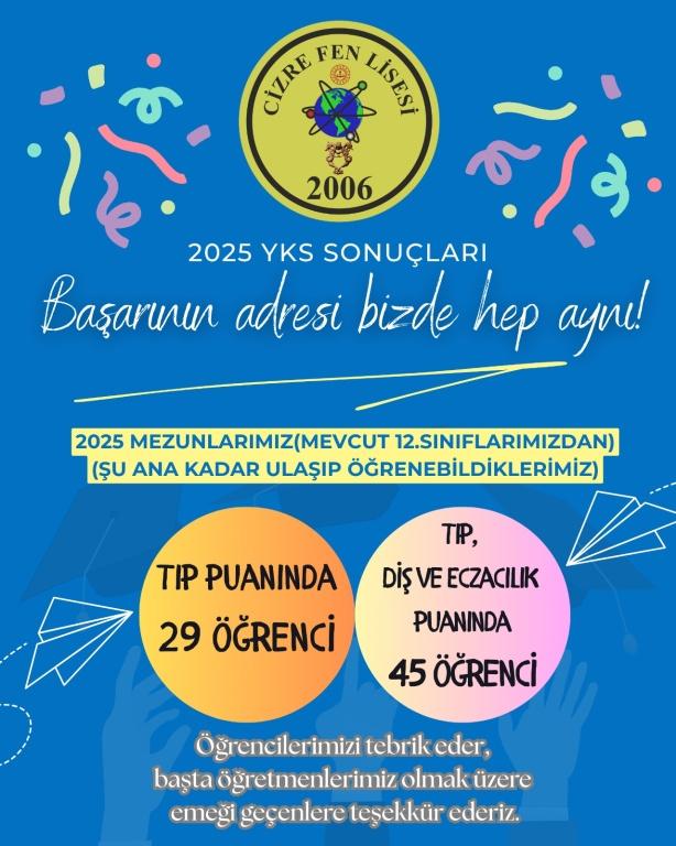 Açıklanan 2025 YKS sonuçlarına göre, mevcut 12.sınıf öğrencilerimizden şu ana kadar sınav sonucunu öğrenebildiğimiz öğrencilerimizin 29'u Tıp Fakültesine giriş puanında, 45'i ise Tıp, Diş Hekimliği ve Eczacılık Fakültelerine giriş puanındadır.